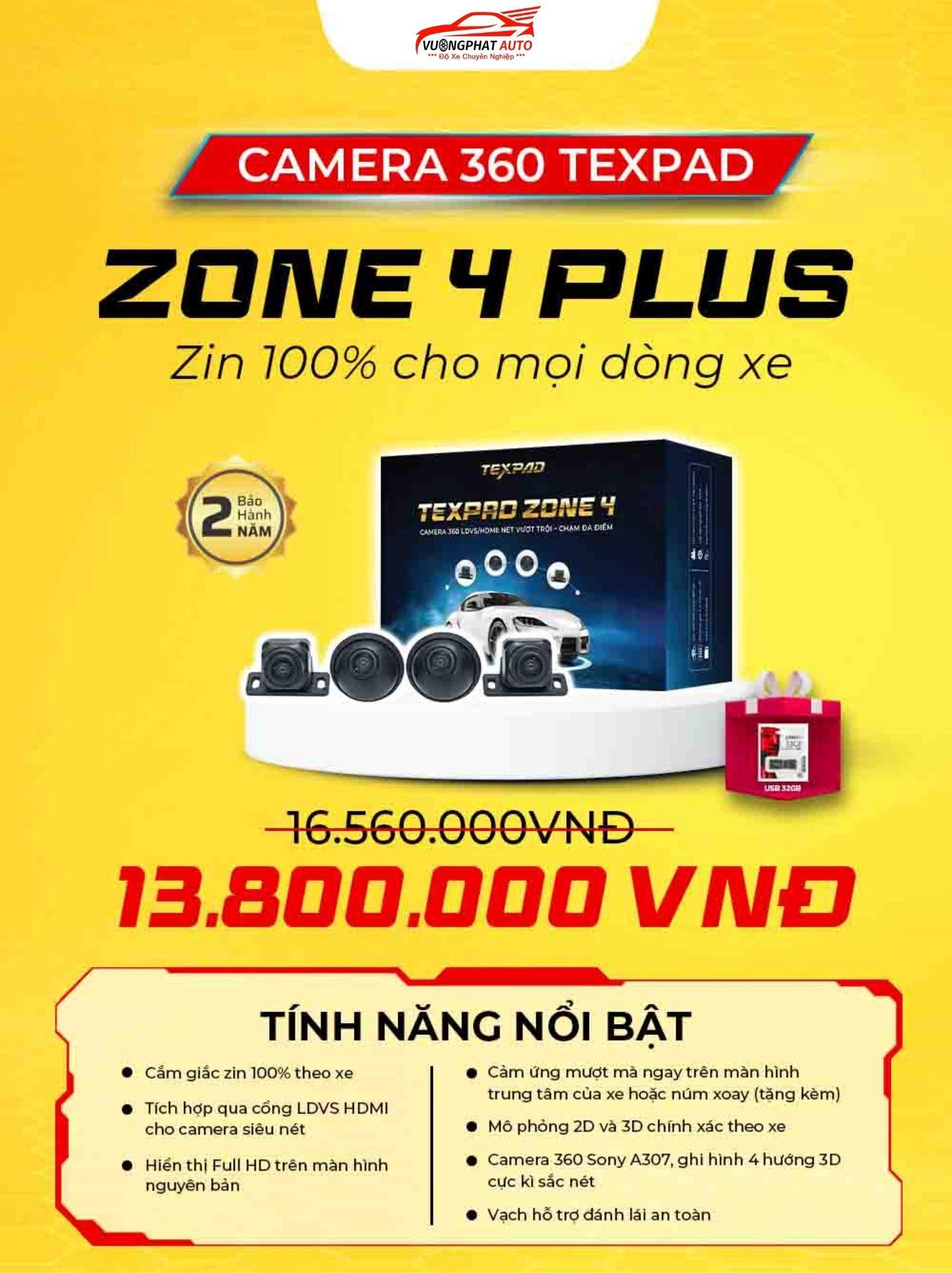 Hiện tại, camera 360 TexPad Zone 4 Plus có giá bán 13.800.000 VNĐ (đã bao gồm chi phí lắp đặt hoàn thiện trên xe ô tô). Sản phẩm đang được VƯỢNG PHÁT AUTO hỗ trợ trả góp 0%.
