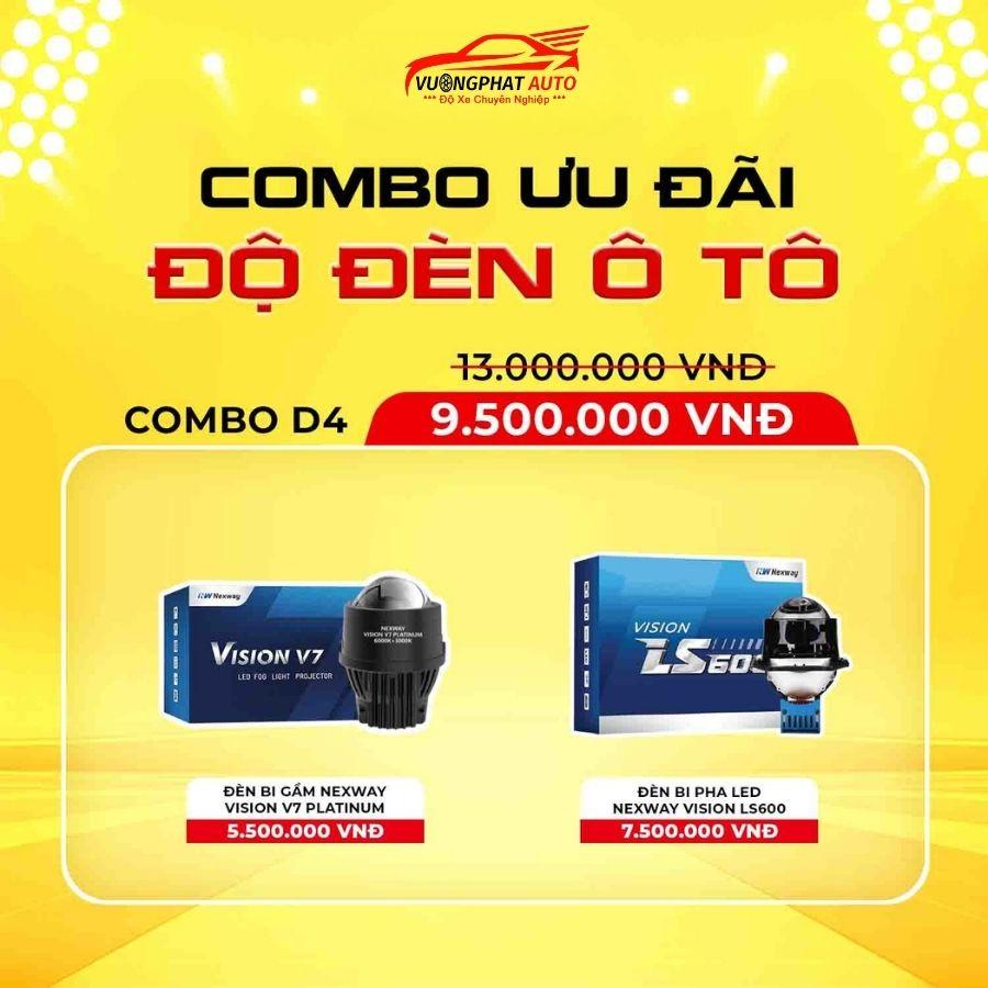 Combo Độ đèn ô tô D4 đang được khuyến mãi 27%, từ 13.000.000 VNĐ giảm còn 9.500.000 VNĐ. Combo D4 gồm 2 sản phẩm đó là: